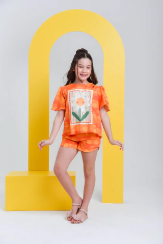 O Conjunto Maria traz conforto e estilo, perfeito para o dia a dia. Feito com tecido leve e macio, garante a respirabilidade necessária para a pele delicada dos pequenos, ideal para climas quentes. O conjunto inclui uma blusa com estampa alegre em tons de laranja e short combinando, facilitando as combinações de looks. É fácil de vestir e cuidar, garantindo praticidade para os pais. Ideal para bebês, oferece liberdade de movimento e toque suave para evitar irritações.