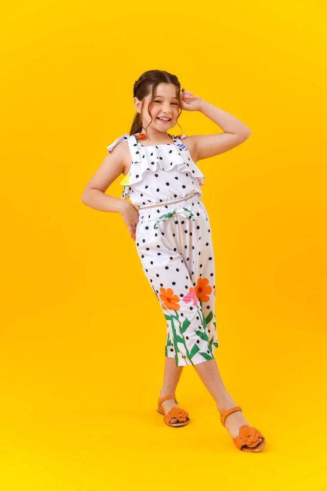 1 Conjunto Paula, composto por 2 peças com estampa de bolinhas e flores coloridas.