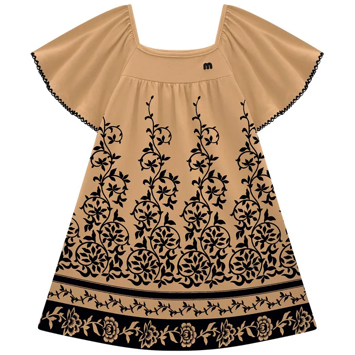 1 Vestido Bia no tom bege com estampa floral preta, disponível em tamanhos variados para melhor ajuste.