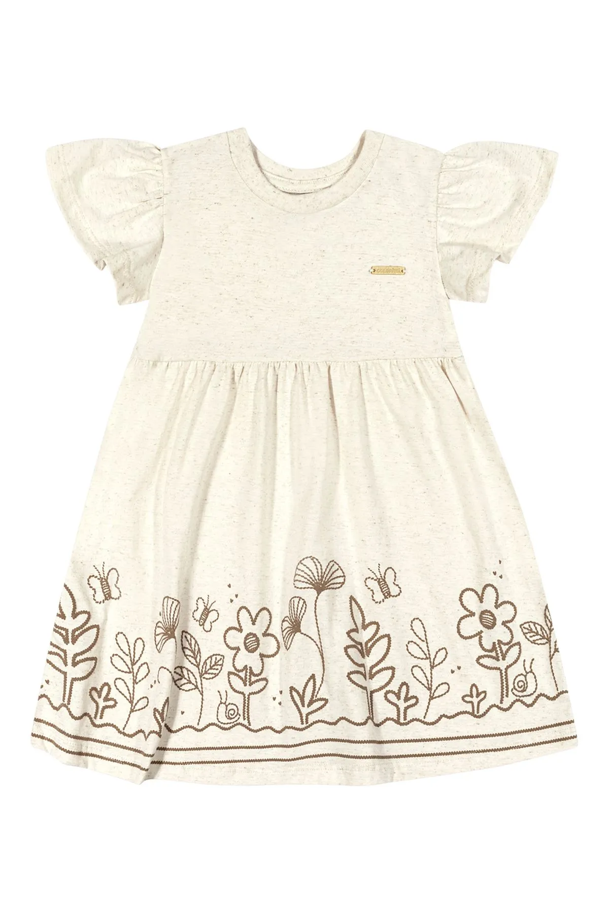 O vestido é confeccionado em algodão com mistura de outros materiais para assegurar durabilidade e fácil manutenção. Seu comprimento e modelagem são adequados para crianças pequenas, promovendo conforto em todas as estações.