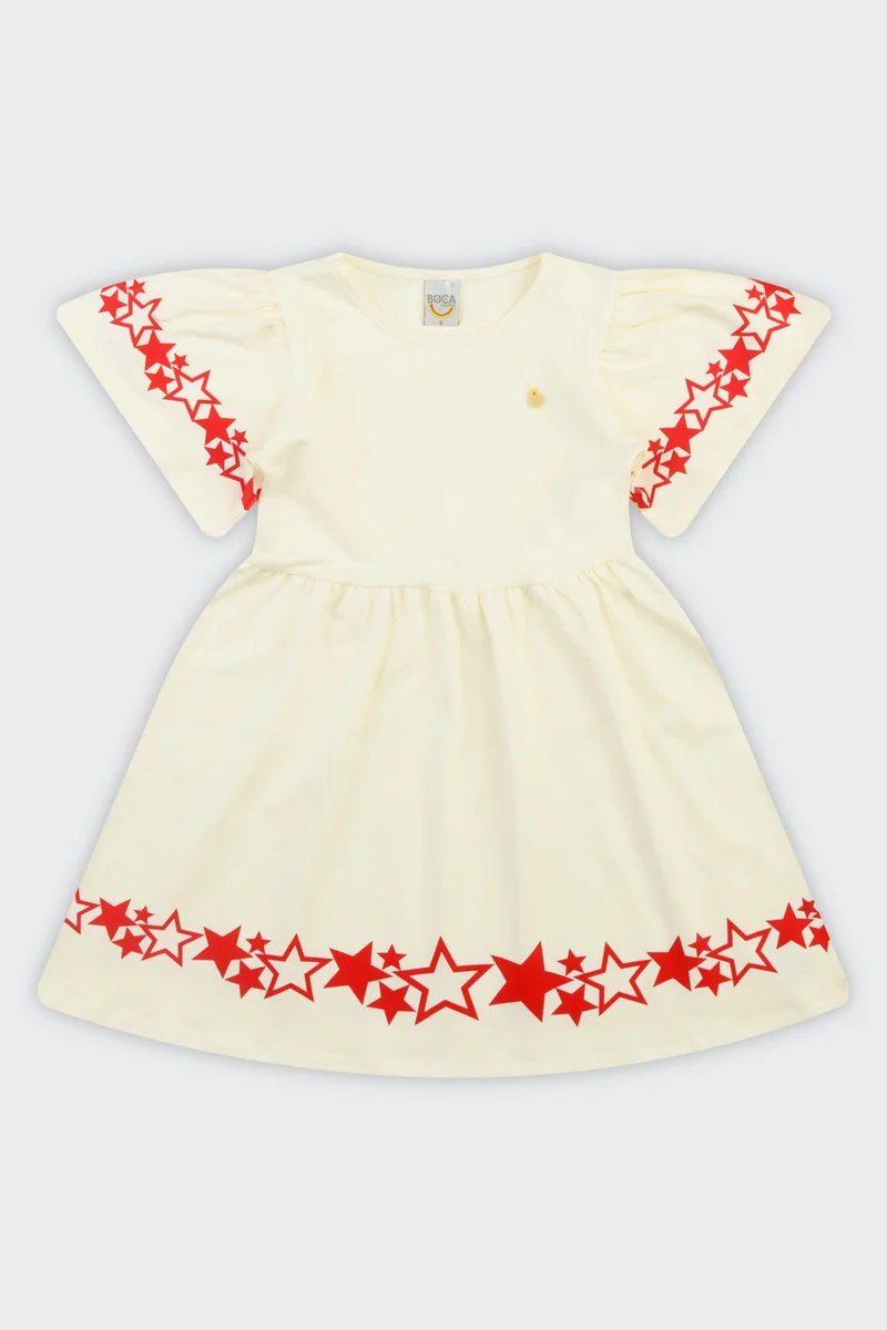 Conheça o Vestido Estela, uma peça encantadora que oferece conforto e estilo para as crianças. Feito com tecido macio e de qualidade, o vestido traz um design delicado em tom branco, com detalhes em estrelas vermelhas nas mangas e na barra, tornando-o perfeito para ocasiões especiais e uso diário.