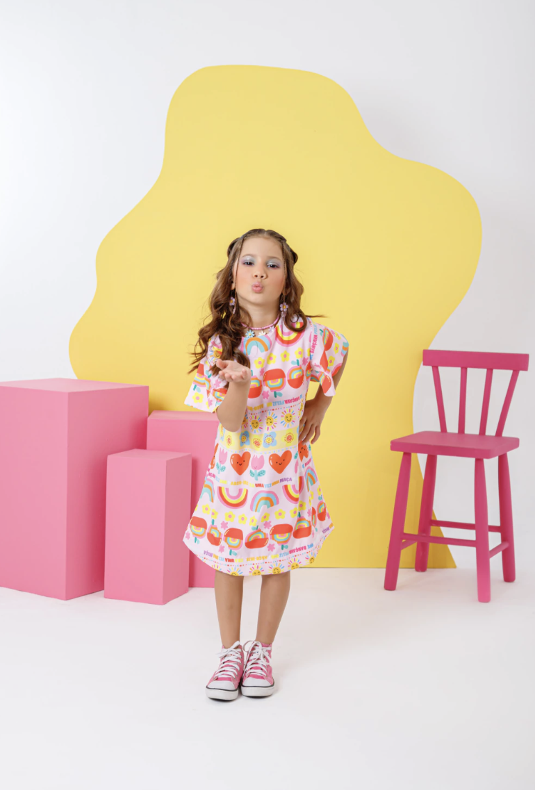 O Vestido Milla é a escolha perfeita para meninas que buscam conforto e estilo. Confeccionado em tecido macio com estampas coloridas divertidas, ele oferece um caimento leve e agradável para o dia a dia. O vestido possui mangas curtas amplas que garantem mobilidade e deixam o look ainda mais alegre. Seu design estampado com elementos lúdicos, como corações, arco-íris e flores, torna-o ideal para ocasiões informais ou passeios. Produto fácil de lavar e ideal para usar em épocas quentes, garantindo frescor e conforto.A peça é feita com tecido leve e respirável, perfeito para uso em dias ensolarados, e apresenta uma modelagem que facilita o vestir e o movimento. O vestido está disponível em tamanhos infantis, atendendo diferentes necessidades de ajuste para a criança. É uma excelente opção para combinar com tênis ou sandálias, criando looks versáteis e práticos para a rotina infantil.